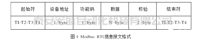 Modbus協(xié)議有兩種傳輸模式:ASC模式和RTU模式。同波特率下,RTU模式較ASCⅡ模式能傳輸更多的數(shù)據(jù),所以工業(yè)網(wǎng)絡(luò)大都采用RTU模式。RTU模式下的信息傳輸報文格式如下圖: