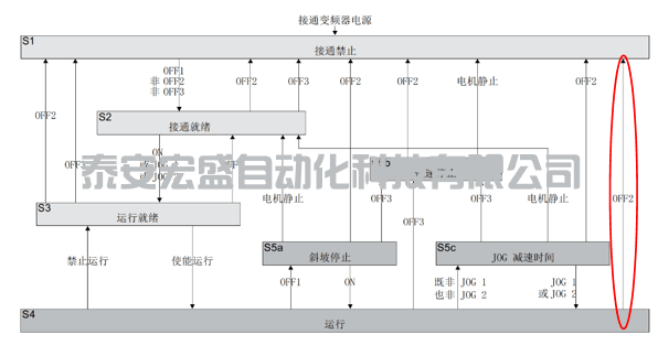 2) 當(dāng)變頻器處于S4運(yùn)行狀態(tài)時,變頻器會按著OFF1斜坡下降時間進(jìn)行制動,電機(jī)靜止后切換為S2接通就緒。