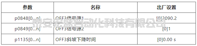 設(shè)置參數(shù)p0848[X],p0849[X]兩個參數(shù)為邏輯與的關(guān)系,當(dāng)有一個參數(shù)置0時,變頻器觸發(fā)OFF3停車命令。