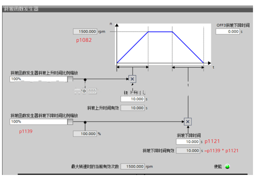 設(shè)置參數(shù)p1121、p1139。在該時間內(nèi)斜坡函數(shù)發(fā)生器的轉(zhuǎn)速設(shè)定值從最大轉(zhuǎn)速(p1082)運(yùn)行到靜止(設(shè)定值 =0),如下圖舉例所示。