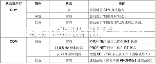 兩個(gè) LED 狀態(tài)指示燈(RDY 和 COM)可用來顯示驅(qū)動(dòng)的狀態(tài)。兩個(gè) LED 燈都為三色(綠色/紅色/黃色)。