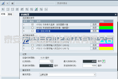 驅(qū)動(dòng)調(diào)試軟件提供了強(qiáng)大的Trace功能,即能夠跟蹤某些重要的參數(shù)(例如轉(zhuǎn)速,輸入輸出電流,直流部分電壓…),并以曲線形式記錄下來,便于調(diào)試人員進(jìn)行分析。工程師可以把需要的驅(qū)動(dòng)信號(hào)添加到信號(hào)表中進(jìn)行跟蹤記錄,進(jìn)行驅(qū)動(dòng)運(yùn)行狀態(tài)的分析,可做為判斷故障的來源輔助手段。