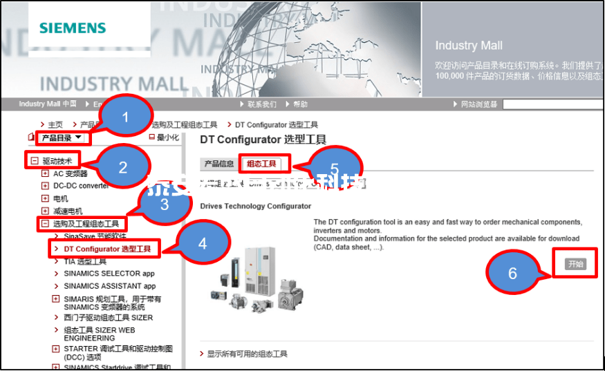 1. 點(diǎn)擊DT-C 網(wǎng)站鏈接,進(jìn)入“西門(mén)子中國(guó)網(wǎng)站”界面,在“產(chǎn)品目錄”下選擇“驅(qū)動(dòng)技術(shù)”>“選購(gòu)及工程組態(tài)工具”>“ DT Configurator 選型工具”,在“DT Configurator 選型工具”界面點(diǎn)擊“組態(tài)工具”>點(diǎn)擊“開(kāi)始”,進(jìn)入DT Configurator 選型工具組態(tài)界面。