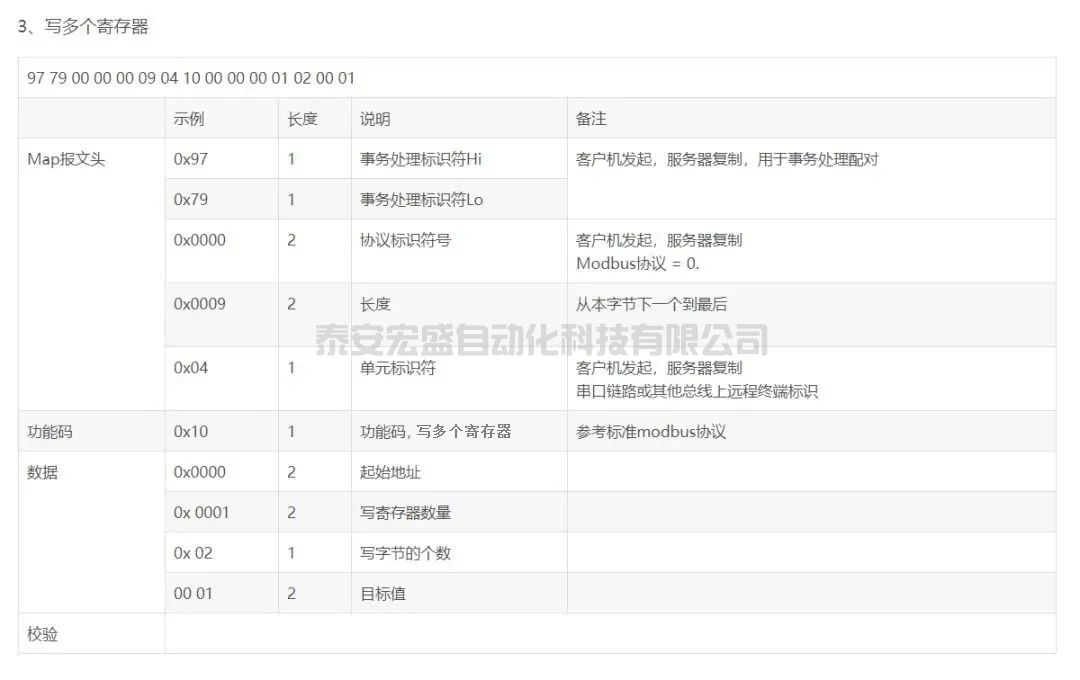 請(qǐng)求:MBAP 功能碼 起始地址H 起始地址L 輸出數(shù)量H 輸出數(shù)量L 字節(jié)長(zhǎng)度 輸出值H 輸出值L 響應(yīng):MBAP 功能碼 起始地址H 起始地址L 輸出數(shù)量H 輸出數(shù)量L