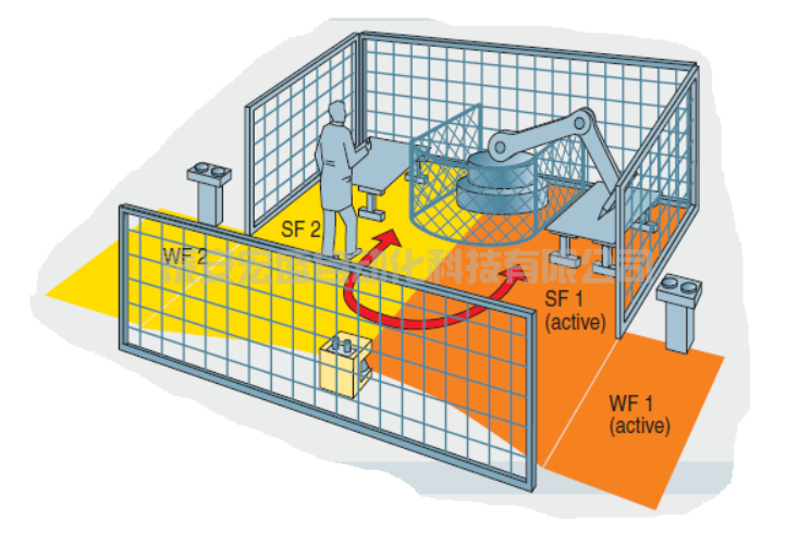 激光掃描儀可根據(jù)機器人的位置監(jiān)視危險區(qū)域,并在機器人進入保護區(qū)域后關(guān)閉其安全 OSSD 輸出(輸出信號切換裝置),從而使 F-CPU 關(guān)閉機器人。