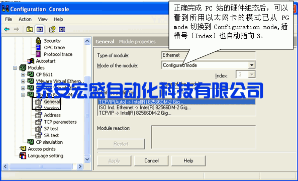 注意:對于Simatic Net V6.1或V6.0版本的軟件,需要在上面窗口中,手動將模塊模式(Mode of the module)從PG模式切換到組態(tài)模式(Configured mode),并設置Index號。然后再在Station Configuration Editor中添加硬件。