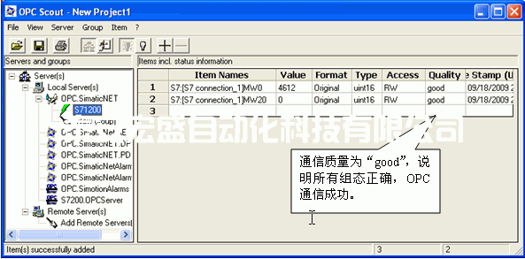 注意:如果通信質量為“bad”,則說明通信失敗,需要檢查軟件組態(tài)及硬件連接是否正確。