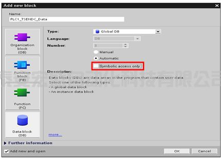 注意:如果訪問數(shù)據(jù)為DB塊,在創(chuàng)建DB塊時不能勾選“Symbolic access only(僅符號尋址)”,單方S7通信只支持絕對尋址的DB塊。