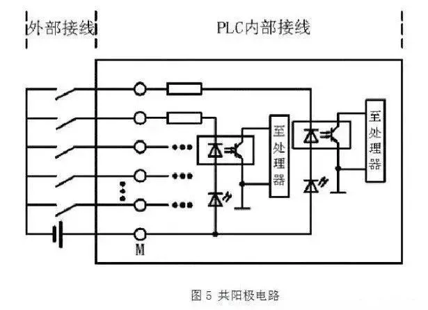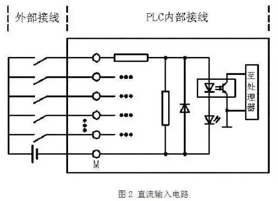 如上圖所示,為直流輸入電路的一種形式(只畫出一路輸入電路)。當(dāng)外部線路的開關(guān)閉合時,PLC內(nèi)部光耦的發(fā)光二極管點亮,光敏三極管飽和導(dǎo)通,該導(dǎo)通信號再傳送給處理器,從而CPU認(rèn)為該路有信號輸入:外界開關(guān)斷開時,光耦中發(fā)光二極管熄滅,光敏三極管截止,CPU認(rèn)為該路沒有信號。