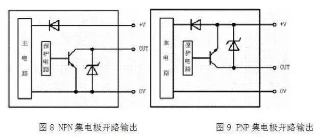 可以看出,NPN集電極開路輸出電路的輸出OUT端通過開關(guān)管和OV連接,當(dāng)傳感器動作時,開關(guān)管飽和導(dǎo)通,OUT端和OV相同,輸出OV低電平信號;PNP集電極開路輸出電路的輸出OUT端通過開關(guān)管和+V高電平信號。
