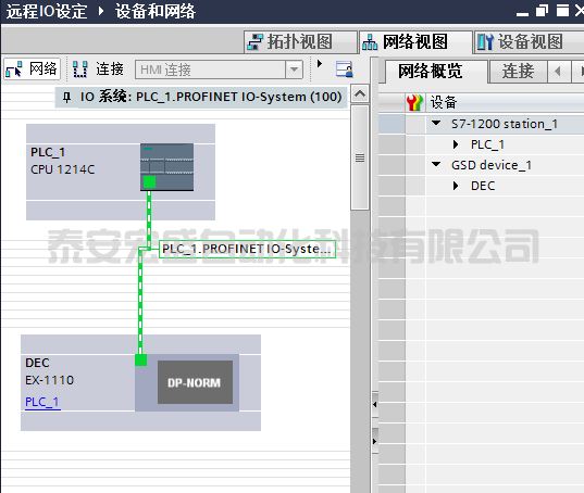 17、硬件添加部分就完成了,下面來看一下添加的I/O模塊地址如何查看,在網(wǎng)絡(luò)視圖中選中添加的設(shè)備,點擊右上角“設(shè)備視圖”這時可以看到設(shè)備概覽也顯示了相關(guān)信息,將窗口向左拉大,就可以看到剛添加的I/O模塊的輸入,輸出開始地址,第一個輸入模塊的第一個輸入點即為“I2.0”輸出第一個點為“Q2.0”