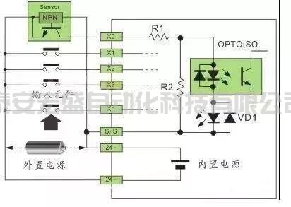 S/S端子與COM端不同的是,COM是與內(nèi)部電源正極或負(fù)極固定相連,S/S端子是非固定相連的,根據(jù)需要才與內(nèi)部電源或外部電源的正極或者負(fù)極相連。