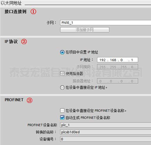 ② “IP 協(xié)議”:默認(rèn)為“在項(xiàng)目中設(shè)置 IP 地址”,此時(shí)在項(xiàng)目組態(tài)中設(shè)置 IP 地址,子網(wǎng)掩碼等。如果使用路由器,則激活“使用路由器”,并設(shè)置路由器地址。也可以選擇“在設(shè)備中直接設(shè)定 IP 地址”,則可以在程序中使用指令“T_CONFIG”或者通過(guò)在線(xiàn)訪(fǎng)問(wèn)、Automation Tool、HMI 等方式分配地址,T_CONFIG 修改 IP,詳細(xì)介紹請(qǐng)參見(jiàn)使用 T-CONFIG 指令修改 S7-1200 的 IP 地址和設(shè)備名稱(chēng)。