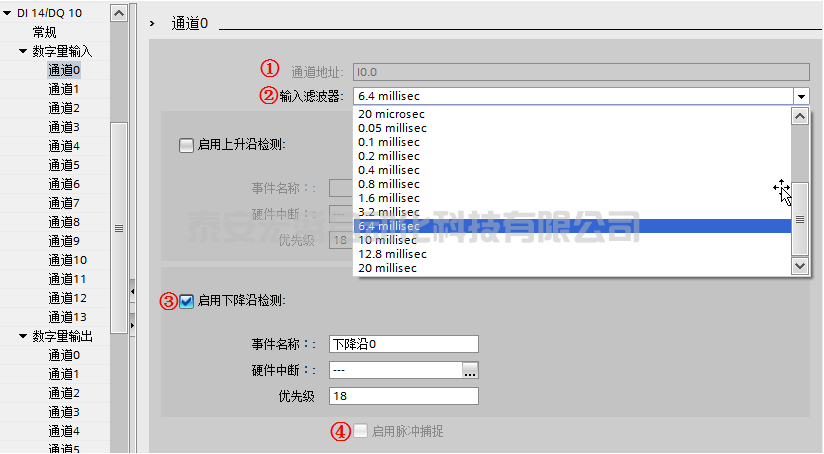 ② “輸入濾波器”:為了抑制寄生干擾,可以設(shè)置一個(gè)延遲時(shí)間,即在這個(gè)時(shí)間之內(nèi)的干擾信號(hào)都可以得到有效抑制,被系統(tǒng)自動(dòng)濾除掉,默認(rèn)的輸入濾波時(shí)間為 6.4 ms;