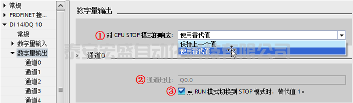 ③ “從 RUN 模式切換到 STOP 模式時(shí),替代值 1”:如果在數(shù)字量輸出設(shè)置中,選擇“使用替代值”,則此處可以勾選,表示從運(yùn)行切換到停止?fàn)顟B(tài)后,輸出使用“替代值 1”,如果不勾選表示輸出使用“替代值 0”。如果選擇了“保持上一個(gè)值”則此處為灰色不能勾選。
